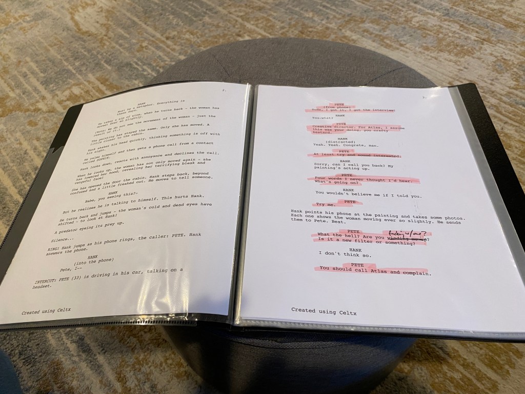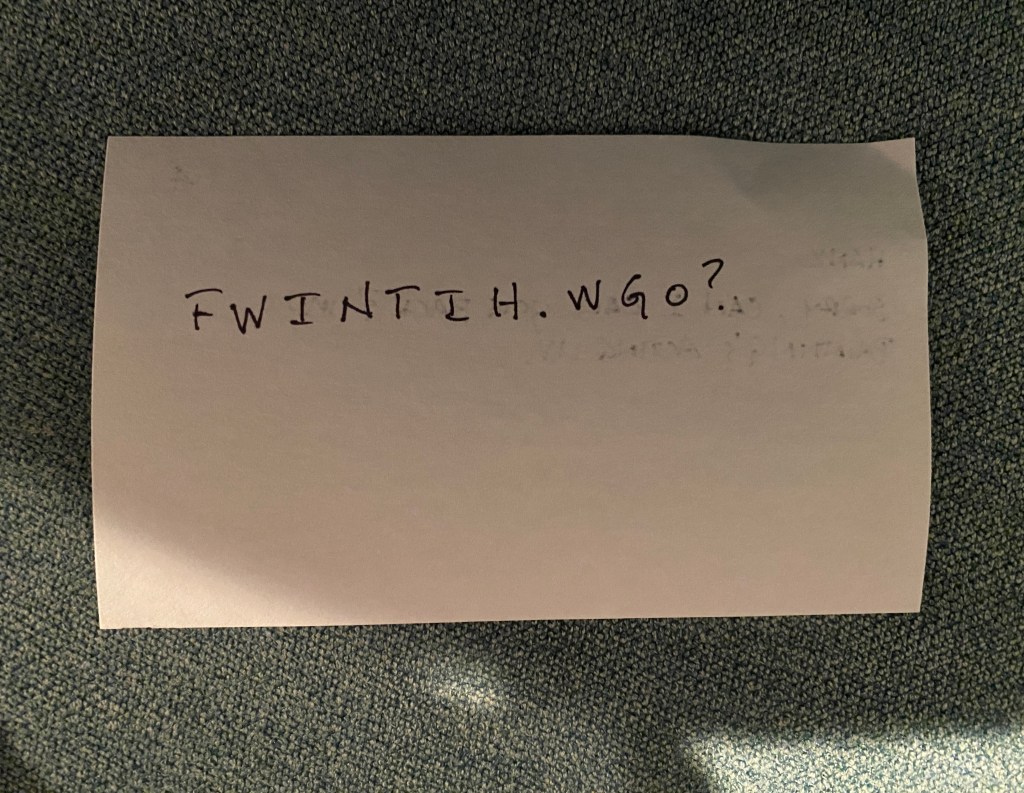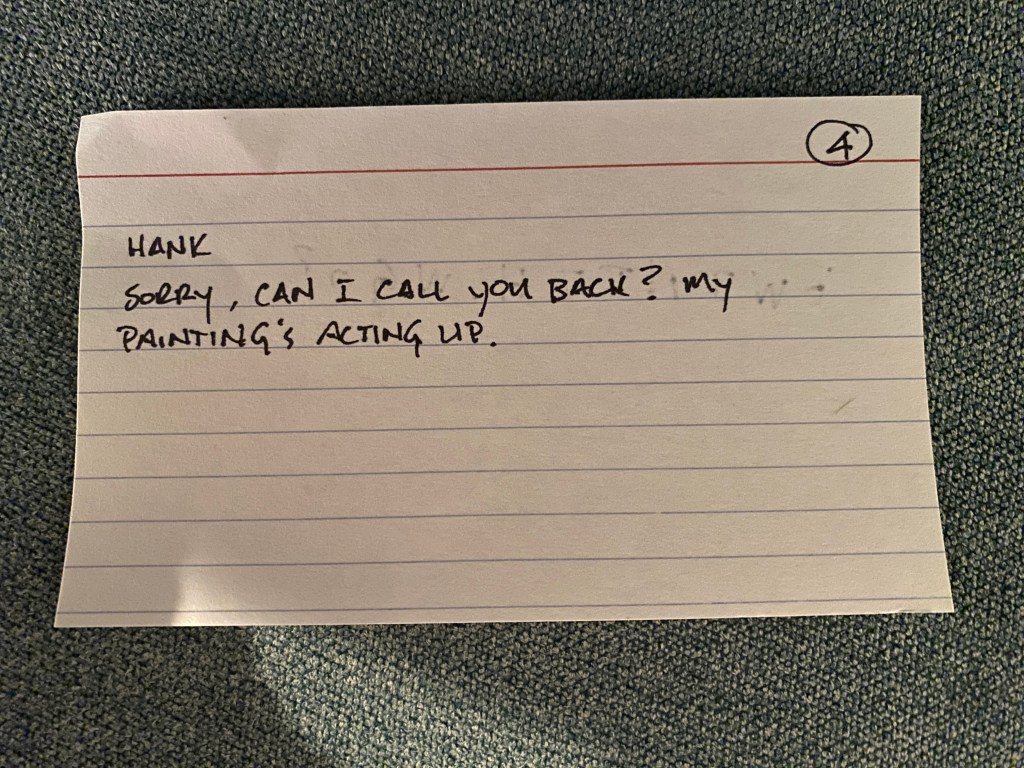 Once I’m there, I number index cards. One for each line I have. One the front, I put the cue line; the line from the character I am playing across. On the back, I write down my line, but only the first letter of each word. I also include punctuation.